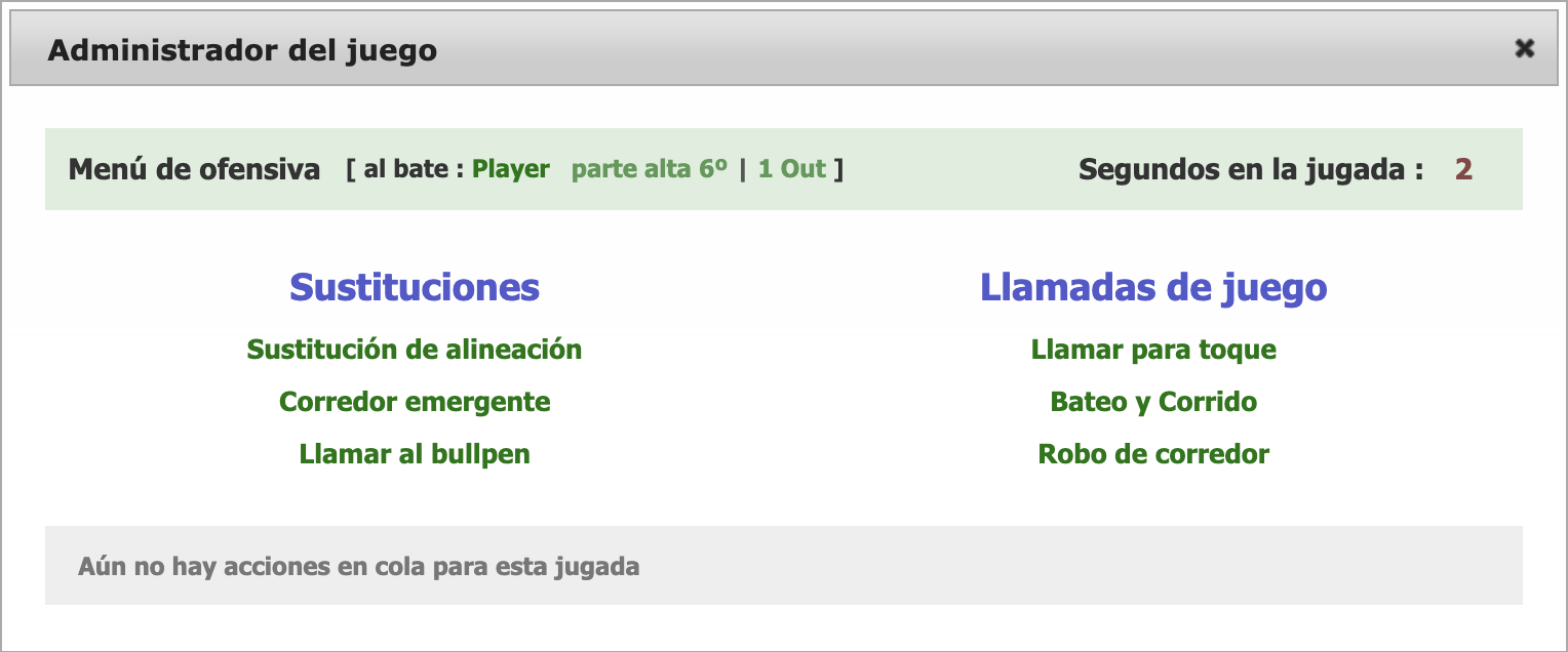 El administrador de juegos tiene dos menús: ofensivo y defensivo, dependiendo de qué equipo está en el campo y bateando. El lado izquierdo del menú corresponde a acciones de sustitución, y el derecho para acciones de juego. Dado que los juegos ocurren en tiempo real, tienes la duración de la jugada para encolar acciones para el enfrentamiento actual entre lanzador / bateador, que se ejecutarán en la siguiente jugada. Cada jugada dura 60 segundos (55 segundos para encolar, con 5 segundos después para finalizar la jugada). Una vez que encolas una acción, no puedes deshacerla. Puedes ver todas las acciones encoladas para tu jugada actual en la sección inferior del menú. Ten en cuenta que todas las acciones encoladas cancelarán cualquier condición de relevista que podría ser desencadenada para tu equipo, durante el resto del juego.