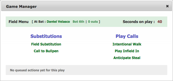 The game manager has two menus : offense and field, depending on which team is fielding and batting. The left side of the menu corresponds to substitution actions, and the right for play call actions. Since the games are occurring in real-time, you have the duration of the play to queue actions for the current pitcher / batter matchup, which will be executed on the next play. Each play is 60 seconds (55 seconds to queue, with 5 seconds after to finalize the play). Once you queue an action, you cannot undo it. You can view all queued actions for your current play in the bottom section of the menu. Note that all queued actions will cancel any reliever conditions that could be triggered for your team, for the remainder of the game.